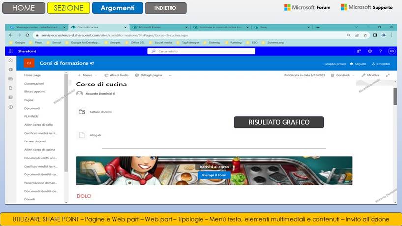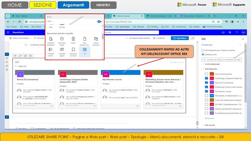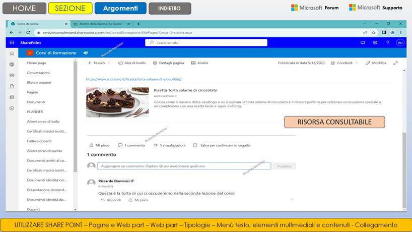 7. Creando un sito secondario “Community aziendale” con web part “Discussione” o “Yammer”, categorie e notifiche.